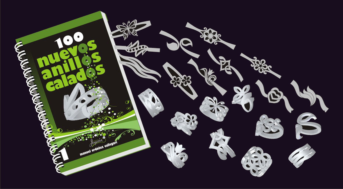 12 FascÃculos con 100 Nuevos diseños de ANILLOS CALADOS en cada uno, los mismos que al ampliar a 18 cm se puede obtener una puñera, también se adjunta un fascÃculo con los diseños en 3D para poder apreciar tanto en Oro como en Plata el trabajo terminado.