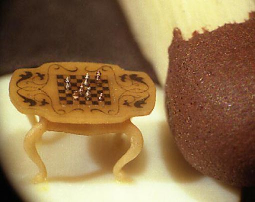Si yo les dijera que hicieran un juego de ajedrez en oro y plata, seguramente me dirán ¡eso es fácil! Pero el reto está en hacerlo de altura de las piezas, hechas de 0.15 a 0.30 mm. Es decir estamos hablando de la tercera parte de un milÃmetro en el caso del Rey y la Reyna imagÃnese los peones. Este juego esta para jugarlo con unos visores de gran aumento, hacer enroques, mover el caballo, planificar jaques con torre y alfil en micro miniatura, pero por favor sin estornudos.